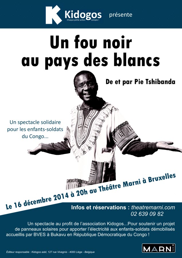 N’oubliez pas notre RDV le mardi 16 décembre à 20h au théâtre Marni à Bruxelles où Pie Tshibanda, notre parrain, met en scène une nouvelle version du « Fou noir » en soutien à Kidogos et à nos projets pour les enfants-soldats démobilisés accueillis par le BVES à Bukavu en RD Congo.