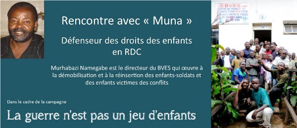 « J’aimerais que tous ceux qui auront l’occasion de lire cette histoire, qui que ce soit, vous vous donniez 5 minutes après la lecture pour penser aux problèmes que certains jeunes de moins de 18 ans, des enfants de la RDC, ont subi mais aussi à ceux qui continuent à croquer un morceau dur de l’os dans l’armée et au fait qu’il manque des personnes pour les aider ! Alors c’est à vous, mon cher ami, parent, animateur, homme d’affaire, membre d’une organisation, membre de l’église, politicien,… de savoir quelle sera votre participation ou implication dans le problème des enfants soldats que vous écoutez, peut-être pour que l’enrôlement et le recrutement des enfants soldats en RDC puisse prendre fin. »